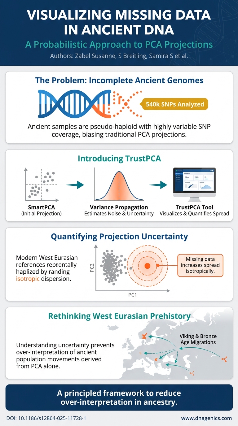 A probabilistic approach to visualize the effect of missing data on PCA in ancient human genomics.